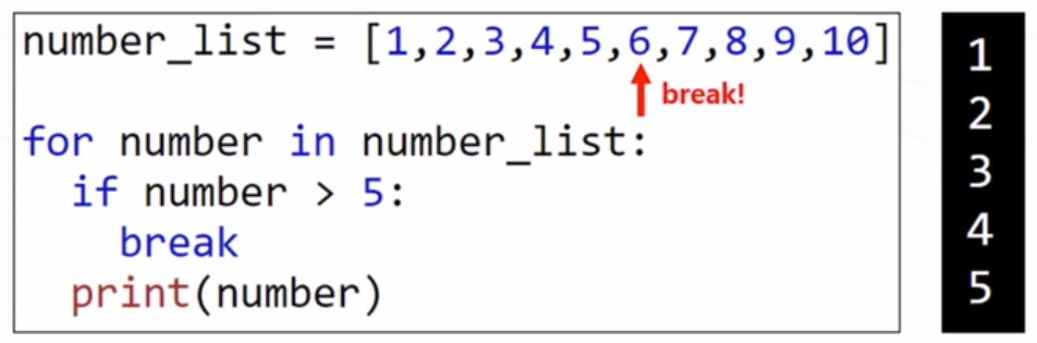 - if문 내부에서 주로 사용되며, 특정 조건이 True일 때 중단한 후 다음 반복으로 이동