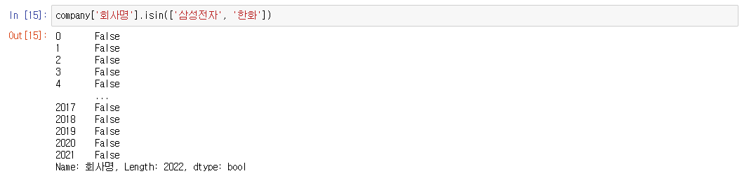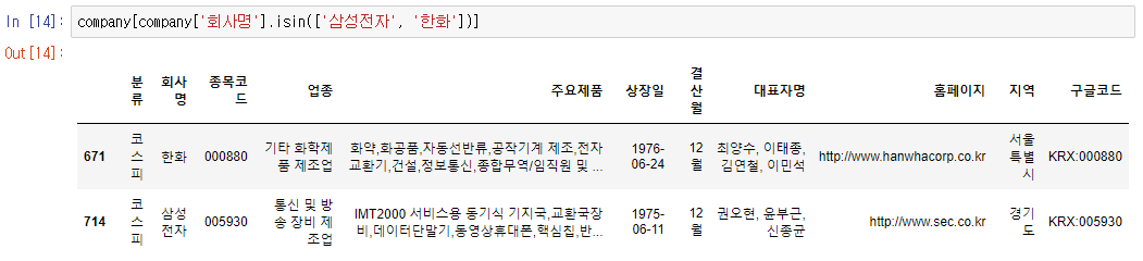 company['회사명'].isin(['삼성전자', '한화'])