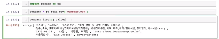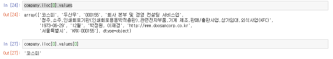 company.iloc[0].values -> numpy의 array형으로 아래와 같이 데이터를 가지고 올 수 있음