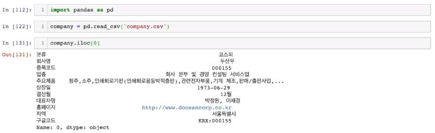 company.iloc[0] -> 인덱스를 활용하여 데이터 가져오기 (해당 행을 시리즈 형태로 가지고 옴)